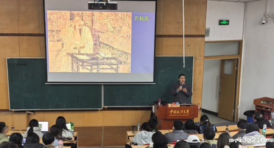 黄教授以学者的严谨和诗人的敏锐,向同学们揭示了大量的名家画作的“密码”,引领听众穿梭于宋画构建的视觉迷阵。在解析范宽《溪山行旅图》时,他聚焦若隐若现的禅宗行脚僧形象,解读宋代士大夫在山水与庙堂间求索生命真谛的精神隐喻,分享他体会到的跨越千年的精神震颤,令在场听众感同身受。当马远《水图》中的水纹在电子屏上徐徐展开时,他又提醒观众感受逝者如斯夫的灵魂共鸣,谛听线条背后的和理学格物致知的思想潮声。