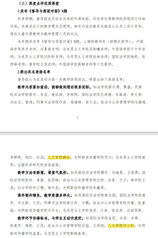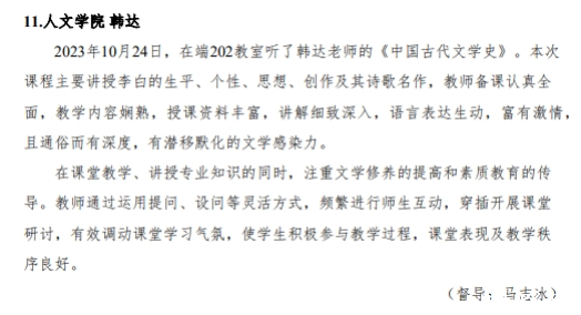 2023-2024学年秋季学期,本科教学督导组全体成员认真履职,全面听评本科课程。在教务处近日发布的第4期竞技宝官方下载入口本科教学督导工作简报中,督导组实名表扬人文学院韩达和付小轩两位教师,并有独立段落特别表扬韩达老师。